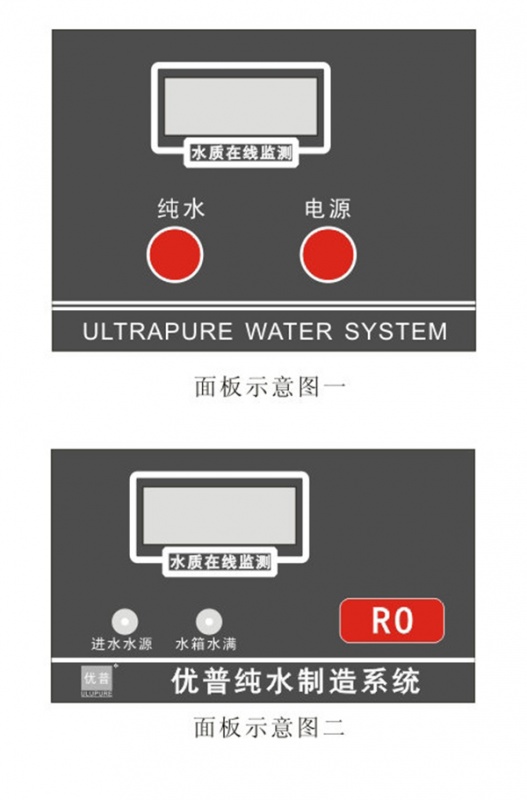 (4)純水取用:輕按“RO”或“純水”按鈕,則RO取水閥打開。從主機(jī)前左側(cè)取水嘴即可取用純水,出水量為每分鐘1.5~1.8升(Ⅱ型機(jī)可同時在控制面板上部的水質(zhì)在線監(jiān)測儀顯示此時管路內(nèi)的純水電導(dǎo)率),再輕按“RO”按鈕即可停止取用純水。(見面板示意圖)