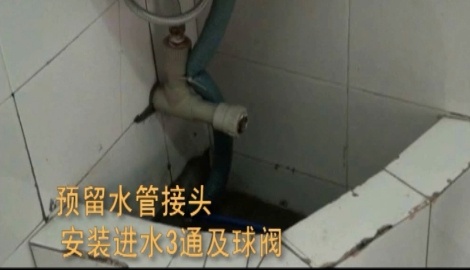2.預(yù)留水管接頭,安裝進水三通及球閥,進水球閥纏生料帶16-18圈,將纏好的進水球閥接入進水三通,用扳手擰緊接頭,再將進水三通纏生料帶11-13圈,將進水三通和球閥裝在預(yù)留水管接頭處,并用扳手擰緊固定。