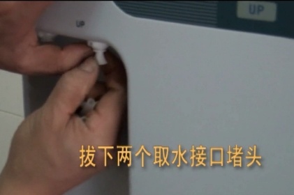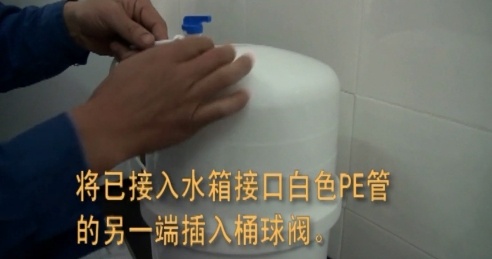 5.拿下水箱頂部藍色蓋帽,在螺紋處纏生料帶5圈,旋入桶球閥,用手直接擰緊,注意不要用力過大。將已經(jīng)接入水箱接口的白色PE管的另一端插入水箱頂部的桶球閥,然后嵌入卡環(huán) 。