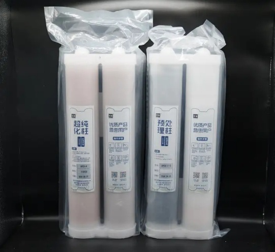 (1)離子交換純化柱:由陰離子交換樹脂和陽離子交換樹脂按比例混合而成。陽離子交換樹脂用其H+交換去除水中的陽離子,陰離子交換樹脂用其OH-交換去除水中的陰離子,在混床樹脂中被交換出來的H+和OH-結(jié)合生成H2O,因此混床離子交換純化柱可用來深度去除RO純水中尚存的微量離子。小型實驗室超純水機中的混床離子交換純化柱通常為一次性使用。